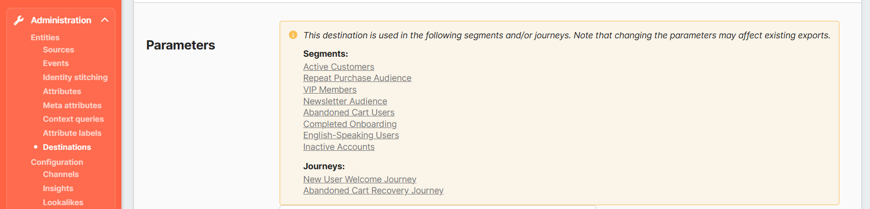 Each destination page shows a list of all segments and journeys that currently rely on it, so you can easily review or update them if needed.