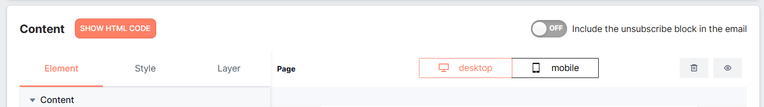 When creating an email campaign in either the Visual Editor or HTML Builder, you can choose whether to include or exclude the unsubscribe block using the toggle in the editor toolbar.
