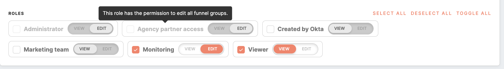 When creating or editing a Funnel Group, you have the ability to specify the roles of different users and their corresponding access permissions. You can choose their access control levels - None, View or Edit. It is important to note that if you don't select a particular user role, users assigned to that role will not be able to see the Funnel Group under the Analytics tab.