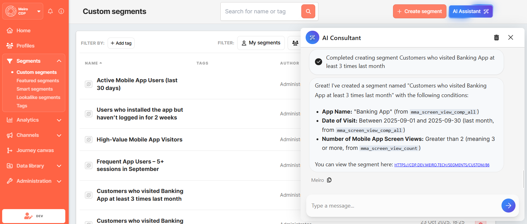 The Assistant translates your request into precise logic, applies the appropriate data source (in this case, mobile app events), and instantly creates a segment ready for use.