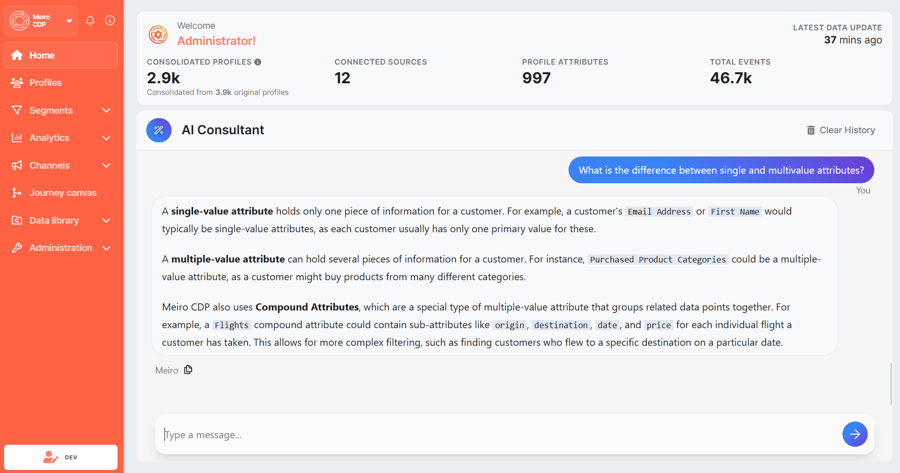 The Assistant is also connected to Meiro’s knowledge base, allowing it to answer practical questions about using the CDP. You can ask things like: