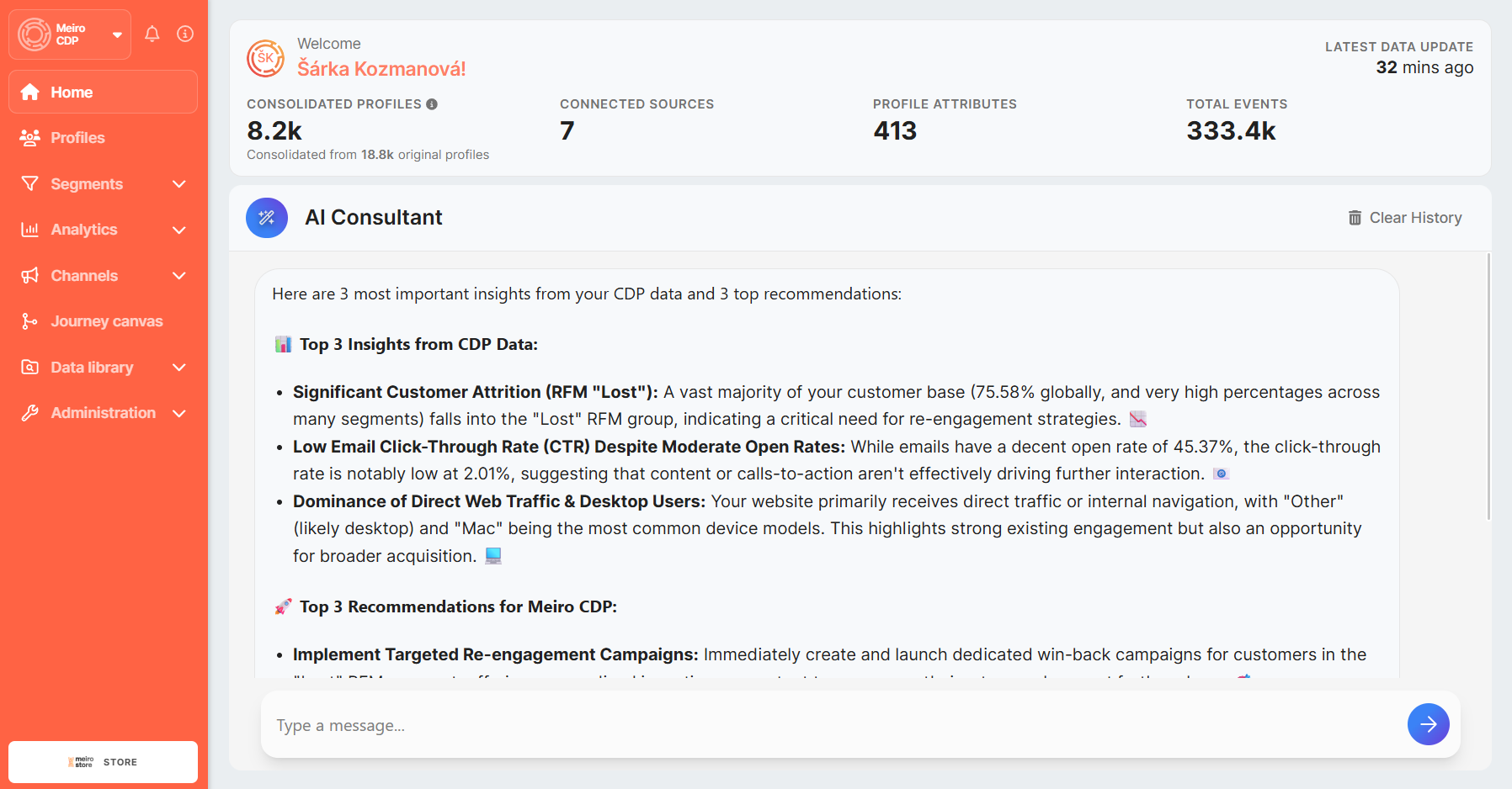The Meiro AI Assistant can help you navigate, explore, and manage your customer data more effectively.