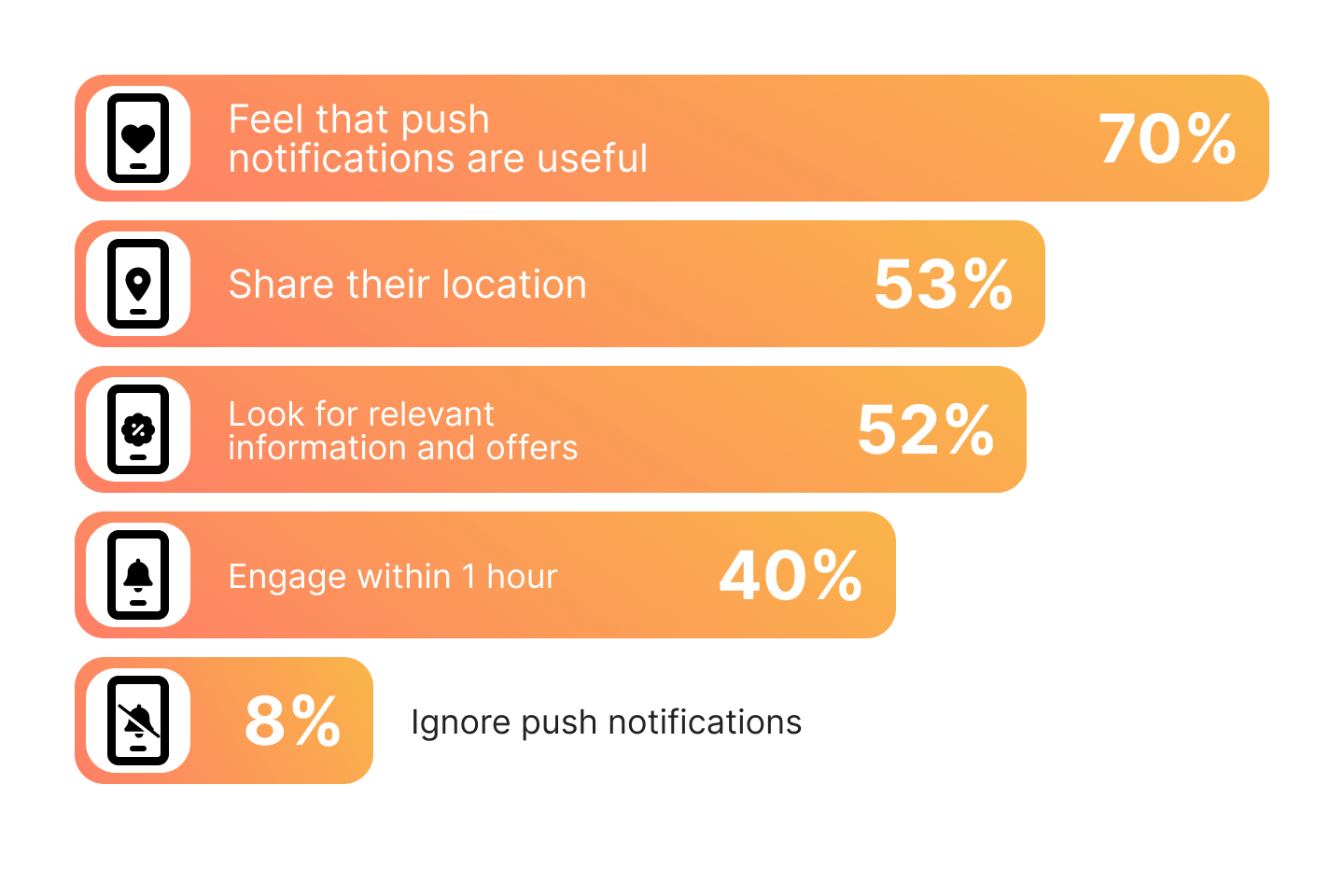 With the Mobile Push, you will automate significant touches between users and your company, along with contacting the users at the most convenient time. While 70 % of mobile users believe push notifications are useful, it is crucial not to annoy customers with continuous notifications coming. Remember that notifications appear directly on the user's device screens, and good practice is to send valuable content and prevent spamming of your customers.