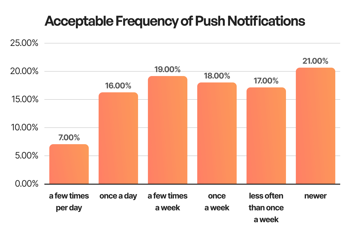Regarding the frequency of sending push notifications, the right frequency varies from one type of business to another. Let's say you are a banking system that notifies your customers about all transactions with their banking card, it will make more sense to inform users of every transaction done, even if there were more than ten pushes sent in a day. While if you are a brand related to selling goods, sending push notifications twice a week is the right way to remind users of different promotions, ad campaigns, abandoned baskets, etc.