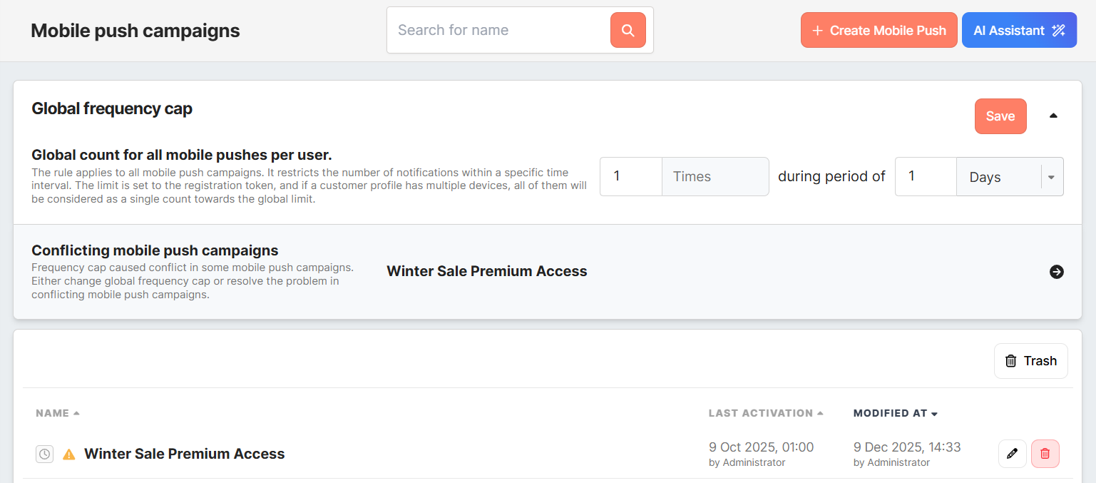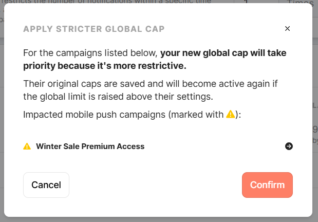 The global frequency cap is a useful tool for managing multiple notifications sent. It is placed in the list of Mobile Push campaigns at the top. Use the expand button to expand settings. Specify the desired frequency of push notification delivery in days or hours. The default limit is set to 1 notification per 1 day. Save to apply changes. Global frequency cap rules overwrite local frequency caps for each mobile push campaign. Frequency cap conflicts When you save the global frequency cap, Meiro checks whether any campaigns have a less restrictive local cap.