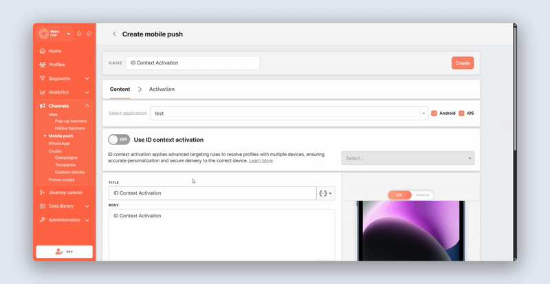 When you enable ID Context Activation in a campaign, notifications are activated per device, ensuring precise delivery and contextual personalization.