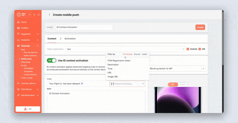Remember: The Use ID Context Activation toggle only appears once at least one ID Context Attribute has been created for the Mobile Push channel.