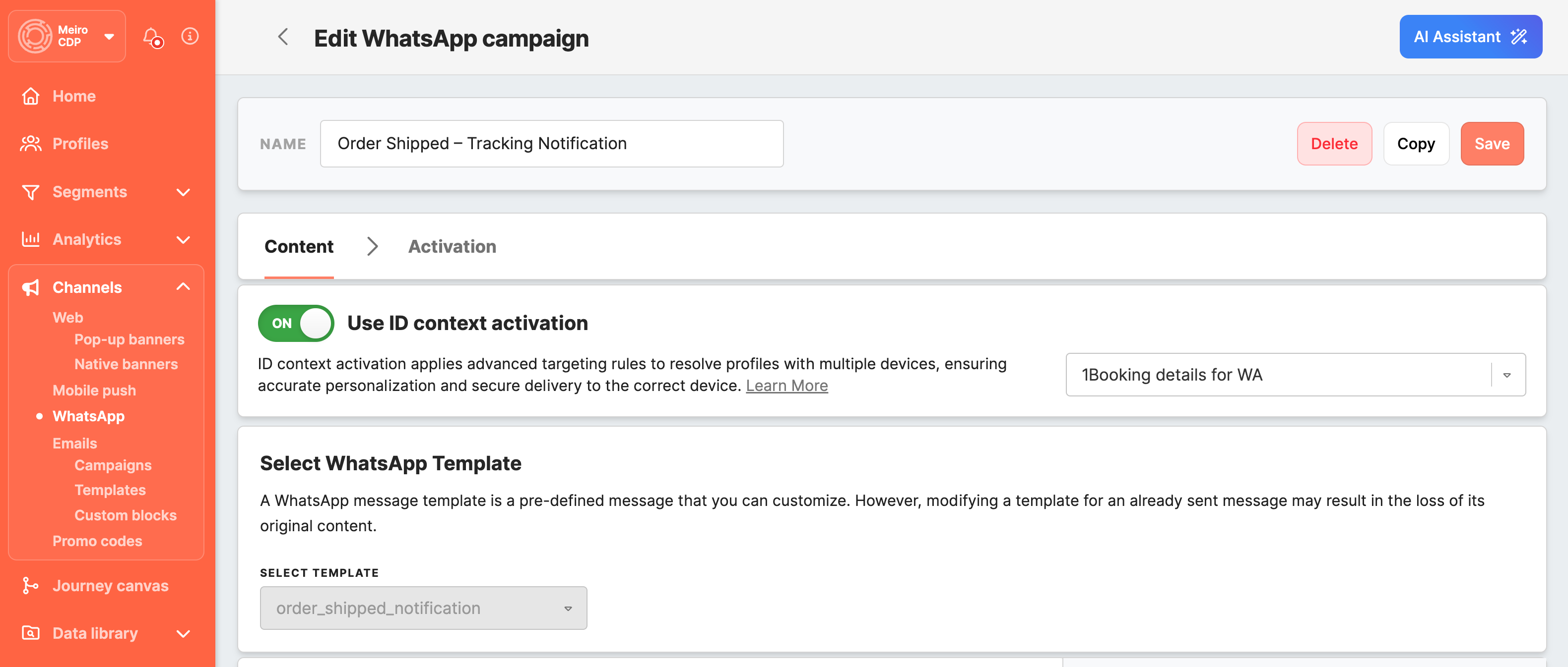 Transactional WhatsApp campaigns require ID context activation. This means you must select the attribute that contains the recipient’s phone number to be used for delivery. This helps ensure the message is sent to the correct identifier.