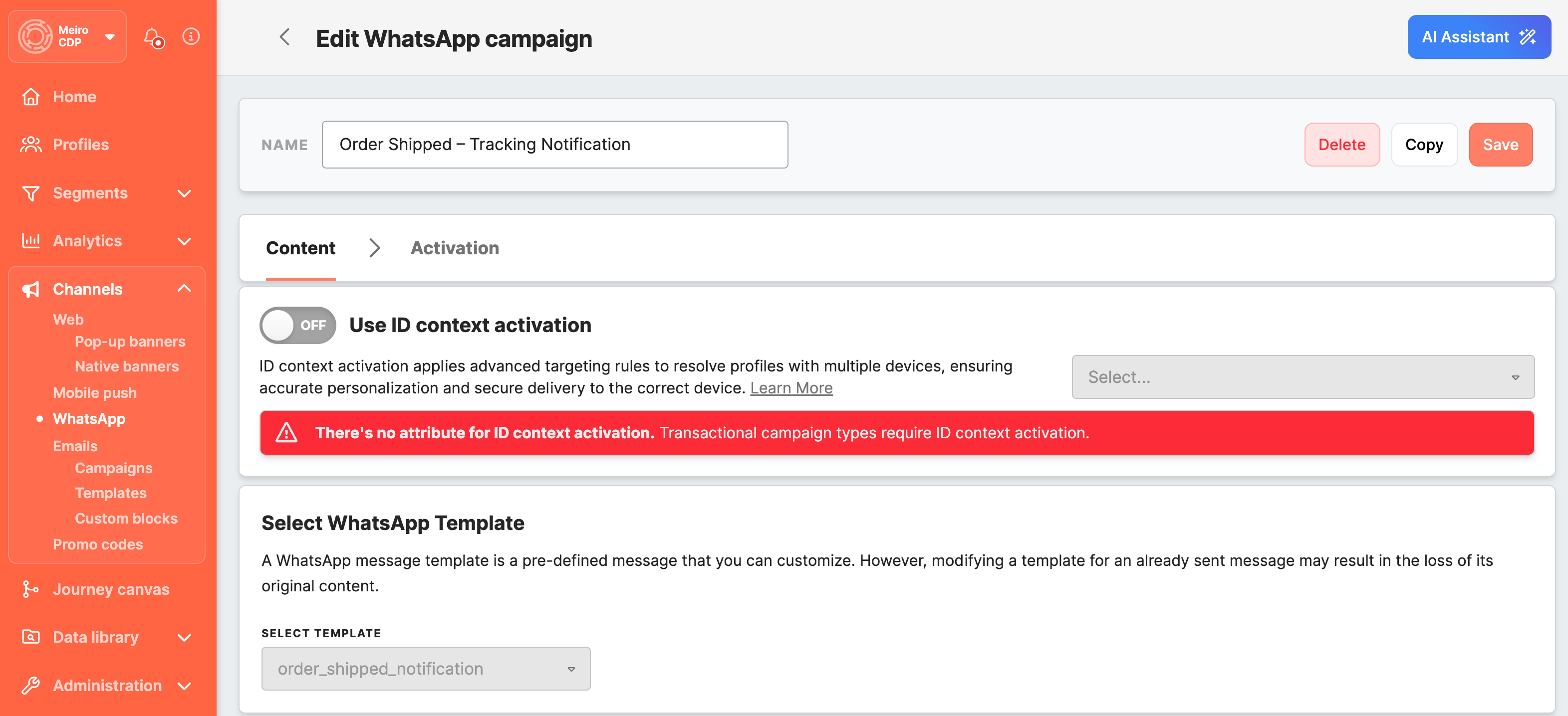 You can create and edit a WhatsApp campaign based on a transactional template without selecting an ID context activation attribute. However, the campaign cannot be activated until this configuration is completed.