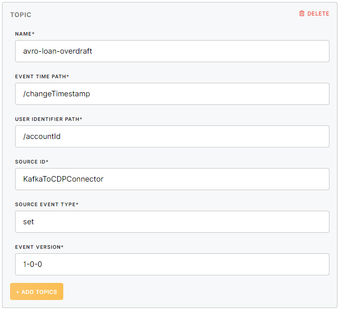 Name of the Kafka topic, where the messages will be consumed from. The topic can be specified for each separate output event stream to CDP. If topics use different schemas, schemas will be dynamically discovered and used accordingly. |