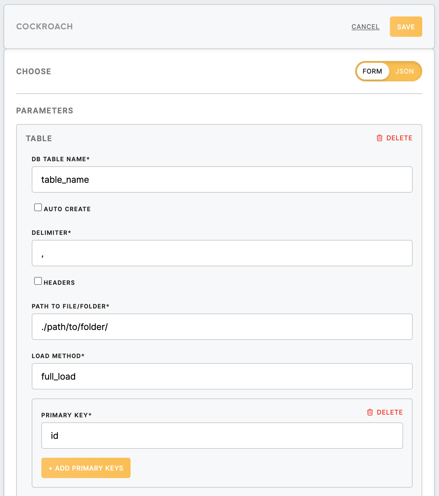 The Cockroach loader is used to load data into a table in the Cockroach database.