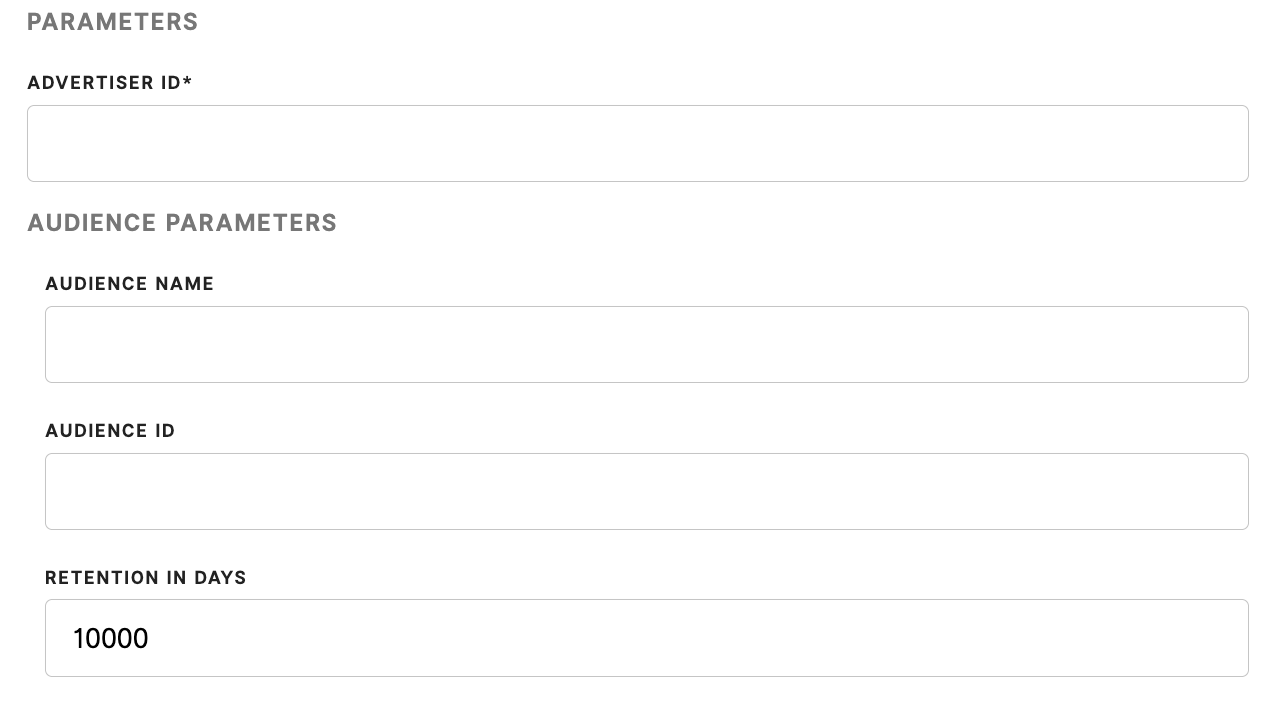 | Advertiser ID (required) | The ID of the advertiser under whom the FirstAndThirdPartyAudience will be created. |