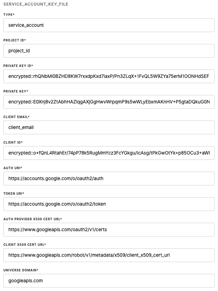 Follow the documentation to set up a service account and then input the relevant values from the service account file into the configuration..