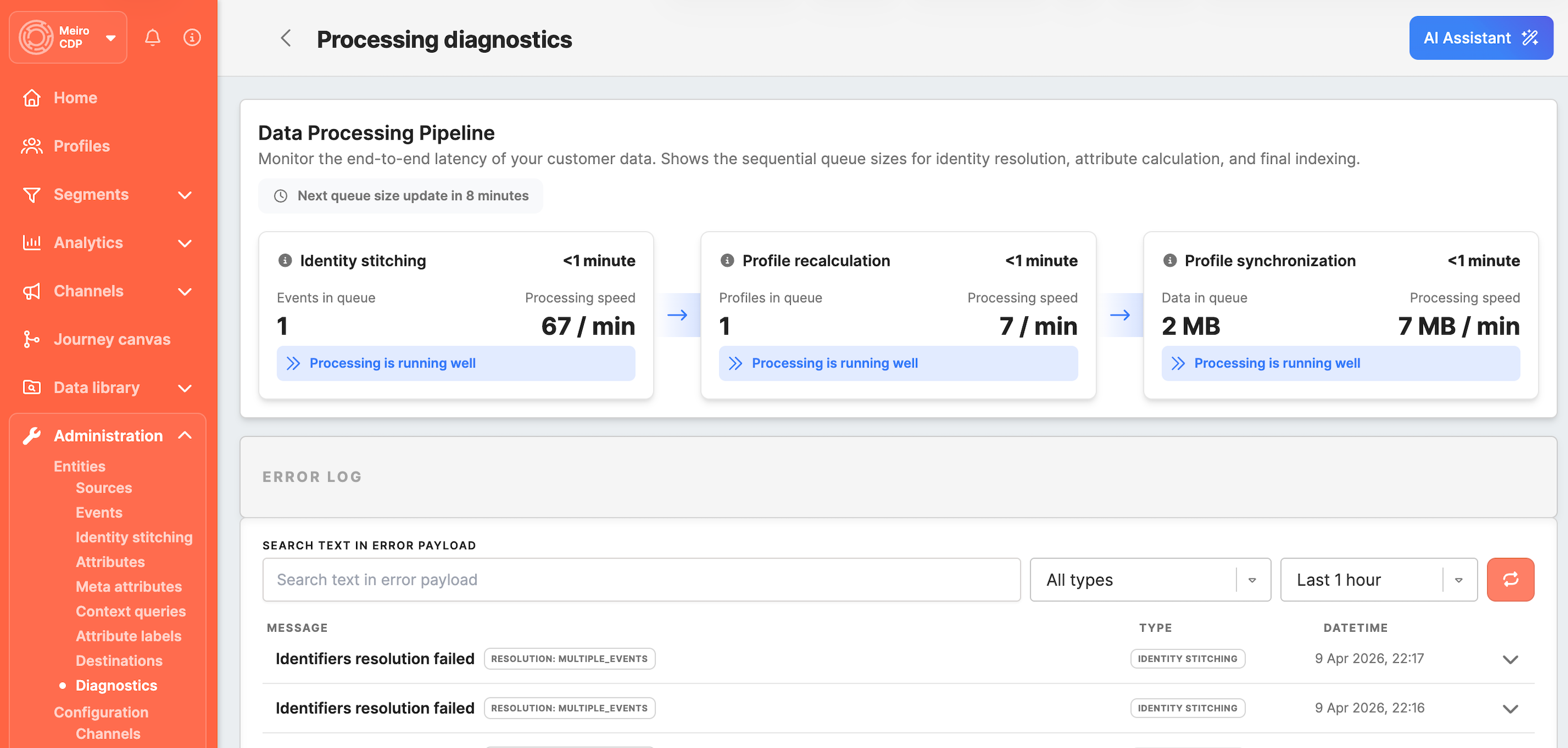 You can now track the full processing pipeline across Identity Stitching, Profile Recalculation, and Profile Synchronization, including queue size and processing speed for each stage. The page also includes an Error Log with filtering by error type and time range, plus searchable and expandable error details for faster investigation.