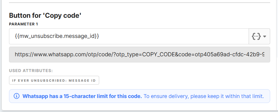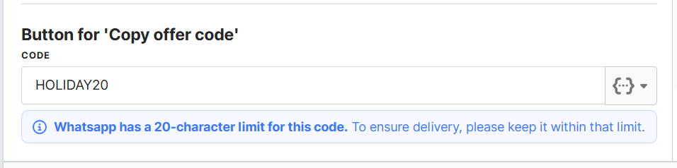 WhatsApp enforces strict character limits for code buttons. If a value is too long, the message will fail — but this can be difficult to detect ahead of time.